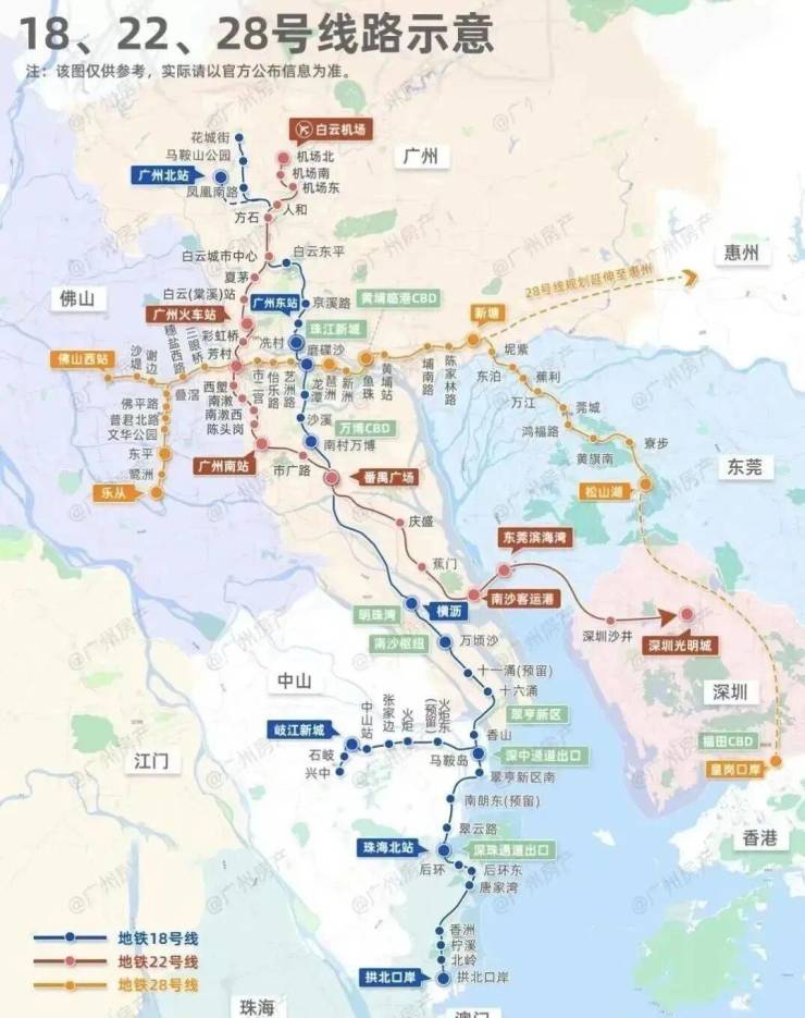 而且,28号线和18号线、22号线,还将组成大湾区以广州为中心的双十字交通大通道,再一次体现了广州在大湾区的交通枢纽地位,量级超乎想象。