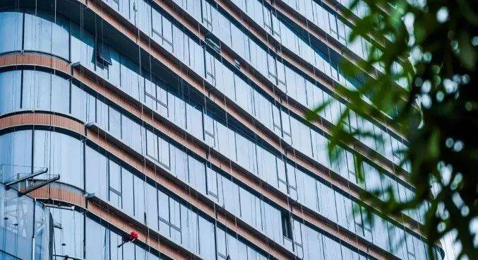 外立面采用木色陶板与全景玻璃幕墙,以“曲水流觞”的涟漪造型呼应珠江文脉,同时融入垂直生态理念,打造空中绿岛与可呼吸的建筑肌理。