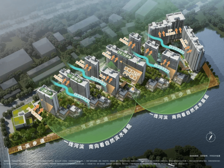 滨水叠墅沿河一字排布,坐拥一线河景,推窗即满眼绿意,出门即漫步滨水碧道