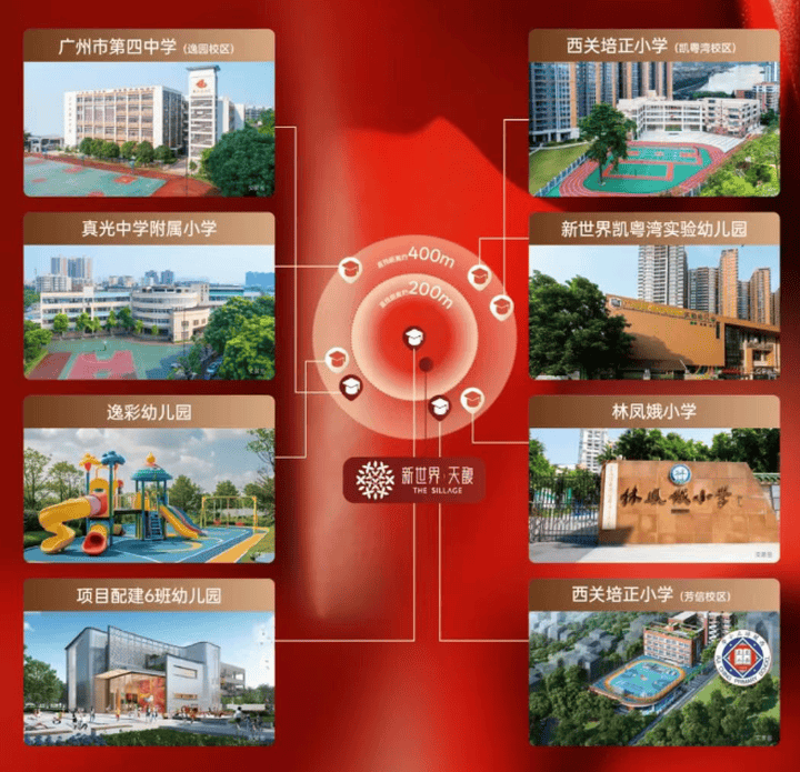 新世界深知家长对于优质教育的热切期盼,交付家门口全龄12年的学霸朋友圈,两所西关培正小学、省级优校广州四中、百年真光等优教资源环伺。