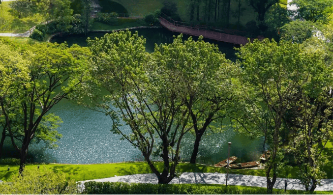 约71万㎡的原生林海,约5万㎡的日月双湖,在这座高楼林立的城市里显得“格格不入”,而缦云广州选择在天河国际生态区扎根,便是怀揣着与半山共融、共生、共长的愿景。从取材到用色都源于半山,折叠了原始的自然生命元素,将生活绘成一幅可久久研读的画卷。