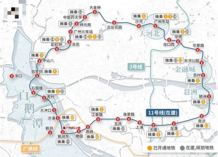 广州11号线以及佛山11号线鹤洞东站双地铁上盖,3横2纵大路网+公交站场+水上巴士,集水、陆、轨等多维交通方式于一体,半小时城央生活圈,1小时湾区生活圈。 11号线共设32个站点,全长44.2km,途径天河、白云、越秀、荔湾和海珠等5个含金量极高的区域,并连接广州火车站、广州东站等交通枢纽。