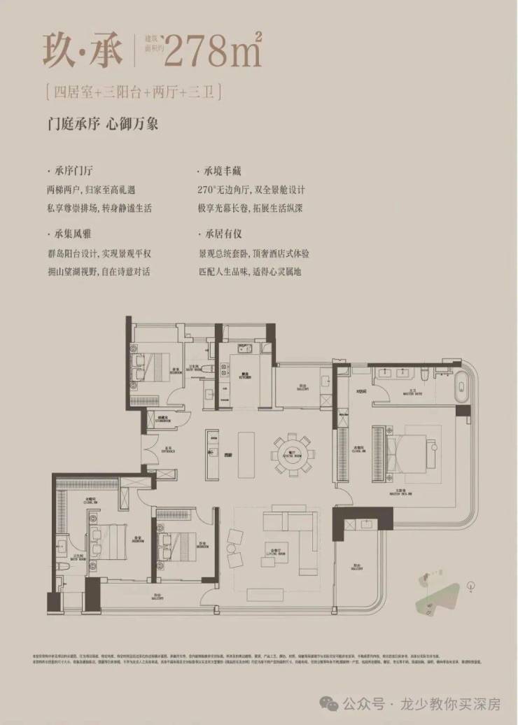 278㎡4房3卫:独立电梯入户,超大南北通一体化客餐厅,三阳台设计,顶级270°景观主卧套房,南向超长全景采光面,户型通透大气。