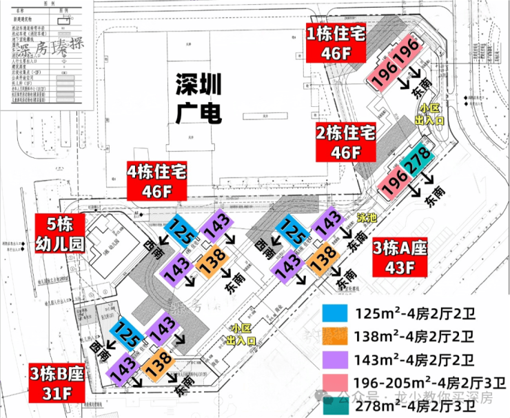 南地块:包含3栋A座(43层),3栋B座(31层)和4栋(46层),均为3T4户,主打125-143㎡改善型产品,另外还有5栋为幼儿园。