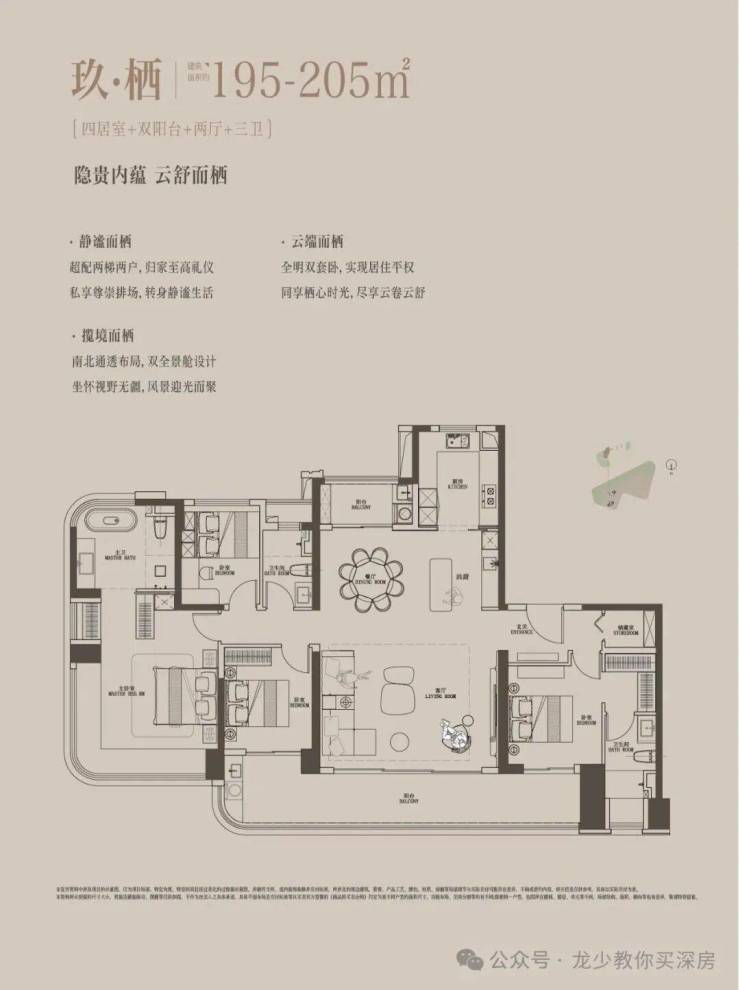 195-205㎡4房3卫:独立电梯入户,中西双厨房,餐客厅一体,双套房设计,端头主卧南北通透,户型方正,四开间朝南,3面采光,整个户型十分通透大气。