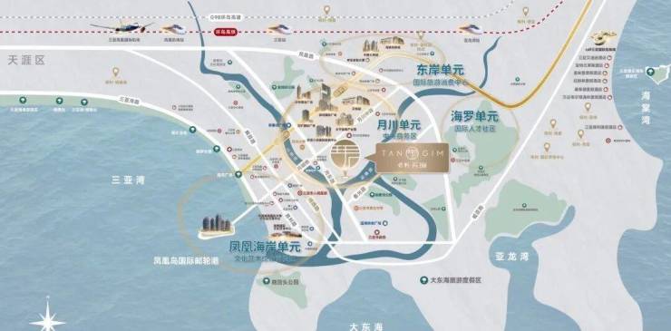 自然资源:三亚河、临春河双河环绕,毗邻金鸡岭公园、临春岭森林公园,山脉起伏、绿脉渗透,彰显东方艺术审美“山-城-河”的对话关系