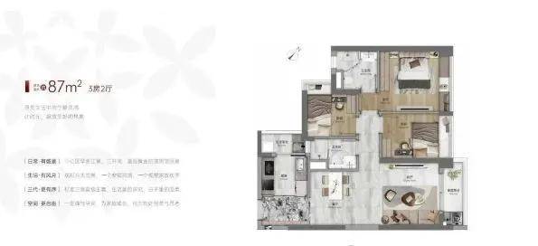 带主套设计,保障主人生活私密性 。89 平户型四开间朝南,阳光充足 。三个房间带有大飘窗,增加空间使用灵活性与采光面 。整体户型布局合理,满足一家三口或四口的居住需求 。