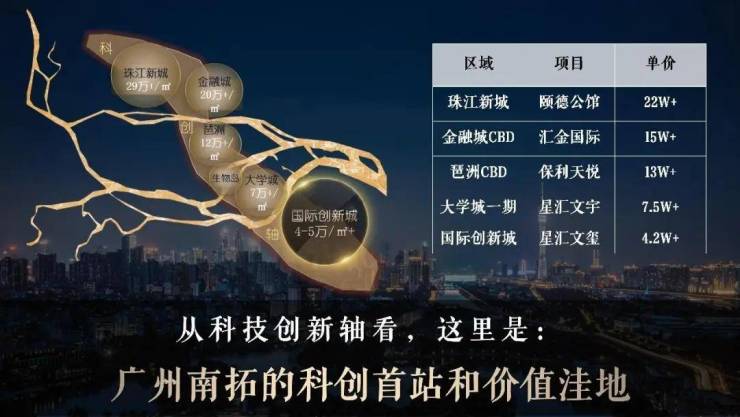 中轴之上非稀即贵,国际创新城是中轴价值南溢首站:金融城无住宅供应,商业大平层15万;琶洲一二手超13万;大学城一期断供12年,二手超7万;