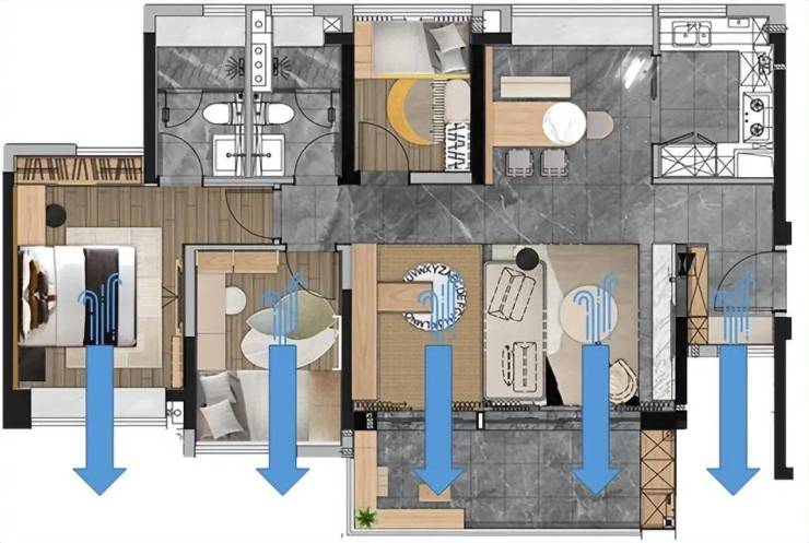 强对流:五开间朝南,客餐厅主卧南北对流
