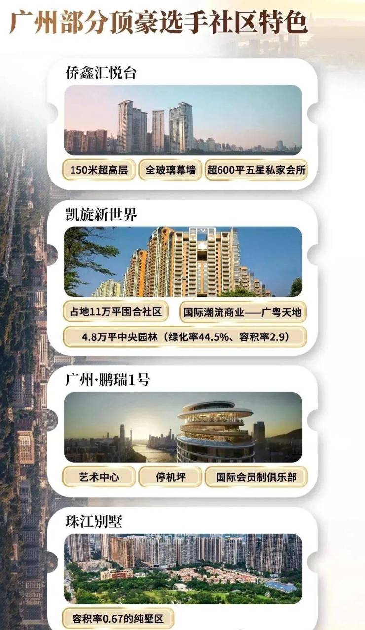 “广粤尊府”是已经开售的珠江新城顶级豪宅凯旋新世界的最后一期,该项目南拥一线珠江景观,北临28万平方米的珠江公园;由12栋建筑组成,共计500多套精品房源,为170至500平方米的大面积单位。目前销售最贵的单位价格超过了10万元每平方米。