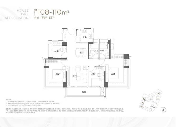 竖庭格局,西南向,基本居住功能与建面约108-110㎡4房2卫一致,但格局不一样,从目前公布的户型图上看,主要是主卧空间有了更大的提升,比如可以放更大一点的衣柜。但从位置上看,它所在的楼栋更靠近主干道,会有噪音影响。