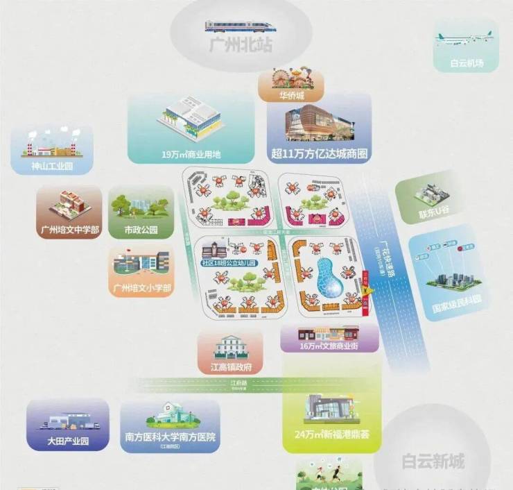 项目是位于白云江高板块,跟白云湖跟花都滨水板块交界,有地铁有商业有现房有期房,属于江高镇的居住区跟中心位置。