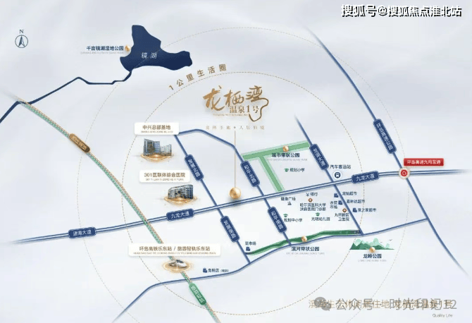 休闲娱乐配套:毗邻九龙大道景观广场,距离千亩镜湖湿地公园约 2.5 公里,距离龙栖湾海岸线直线距离约 3.5 公里,周边还有影剧院、体育馆、长途客运站、公交站等休闲娱乐设施。