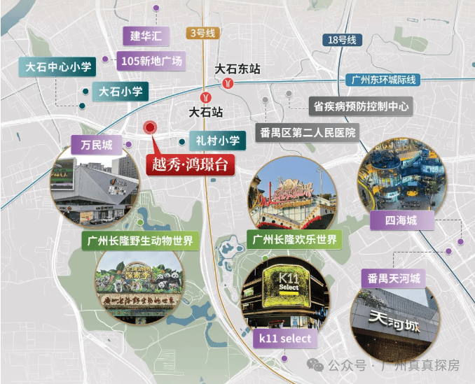 步行约700米至3号线大石站,1站万博,6站直达珠江新城。广州城际大石东站,2站琶洲、3站金融城,与3号线双轨交汇。临近26号线群贤路站(规划中,首次环评已通过),5站客村,6站珠城,与3号线平行有效分流通勤。