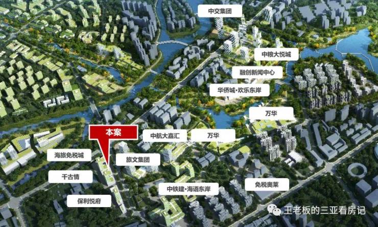 项目位于三亚市吉阳区迎宾路(海旅免税城北侧)。随着自由贸易港政策落地,在总部经济及中央商务区规划中,东岸单元作为建设大型综合消费商圈+总部经济核心区。汇集中粮、中交、保利、中航、中铁建、五矿等世界500强企业,已成为三亚城市功能上的中轴城心,凝聚着最重要的部门,昭示着三亚未来发展的方向,区域价值未来可期。