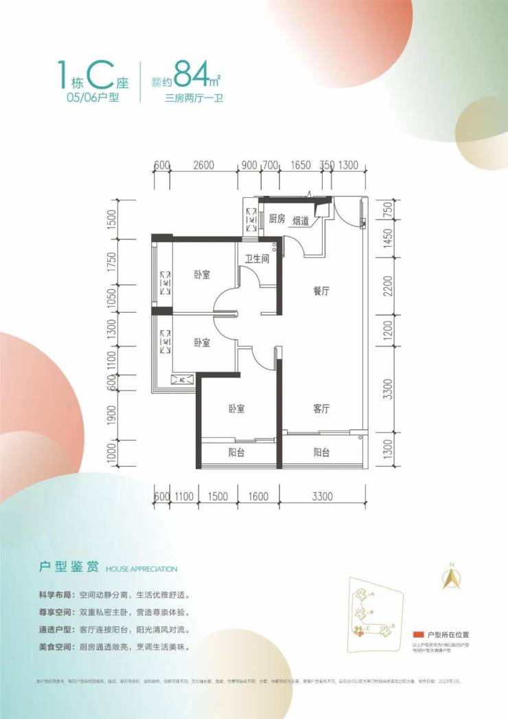 84㎡的3房2厅1卫,1栋C座05.06户型,设计的是竖厅格局,客厅3.3米开间,LDKB一体化,3个卧室分别做到了3.1米/2.8米/2.4米的宽度,客厅主卧双阳台设计,U型厨房,公卫三段式分离,得房率:76.79%(不含赠送),阳台朝东南向,看楼岗大道。