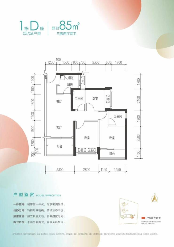 85㎡的3房2厅2卫,1栋D座05.06户型,设计的是经典竖厅格局,客厅3.3米开间,3个卧室分别做到了3.1米/2.8米/2.4米的宽度,客厅主卧双阳台设计,U型厨房,卫生间干湿分离,得房率:76.05%(不含赠送),阳台朝东南向,看楼岗大道。