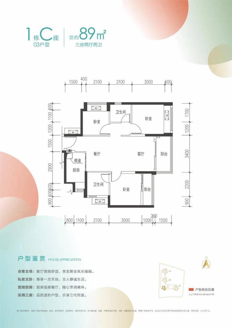 89㎡的3房2厅2卫,1栋C座03户型,设计的是竖厅双龙抱珠格局,客厅3.4米开间,3个卧室分别做到了2.9米/2.9米/2.5米的宽度,客厅主卧双阳台设计,L型厨房,卫生间干湿分离,得房率:76.78%(不含赠送),阳台朝东北向,看楼岗公园。