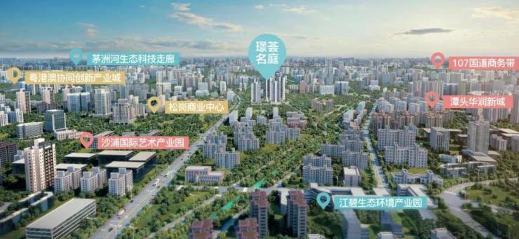 107科创金廊,产业新高地宝安十四五规划中提出:全力推动市政化改造107国道“主动脉”107国道沿线布局了126个城市更新项目,总投资约431.5亿元,华为、中兴、腾讯、宝能、vivo等世界500强企业研发总部入驻,以产业兴城,松岗重点布局会展、航空、科研等产业领域,汇聚311个产业集群,再造深圳高新版图。荟名庭扼守产业之芯,与热土共璀璨。