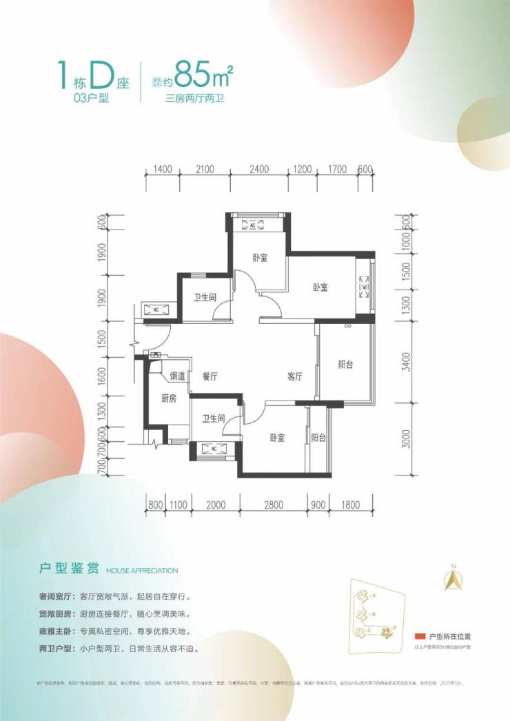 85㎡的3房2厅2卫,1栋D座03户型,设计的是竖厅双龙抱珠格局,客厅3.4米开间,3个卧室分别做到了3米/2.8米/2.4米的宽度,客厅主卧双阳台设计,L型厨房,卫生间干湿分离,得房率:78.12%(不含赠送),阳台朝东北向,看楼岗公园。