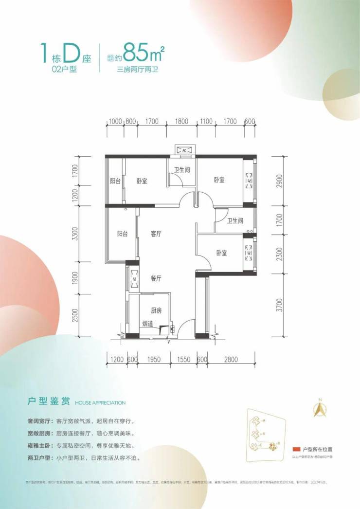 85㎡的3房2厅2卫,1栋D座02户型,设计的是横厅南北通透格局,客餐厅5.2米开间,3个卧室分别做到了2.9米/2.9米/2.3米的宽度,客厅主卧双阳台设计,U型厨房,公卫三段式分离,得房率:78.12%(不含赠送),阳台朝西南向。