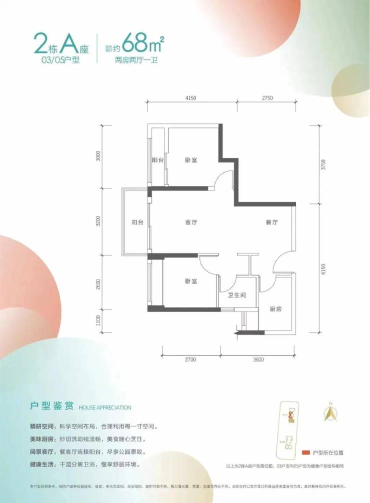 68㎡的2房2厅1卫,2栋A座03.05户型,设计的是竖厅双龙抱珠格局,客厅3.2米开间,2个卧室分别做到了3米/2.6米的宽度,客厅主卧双阳台设计,L型厨房,卫生间三段式分离,得房率:74.05%(不含赠送),阳台朝西向,看楼岗公园。