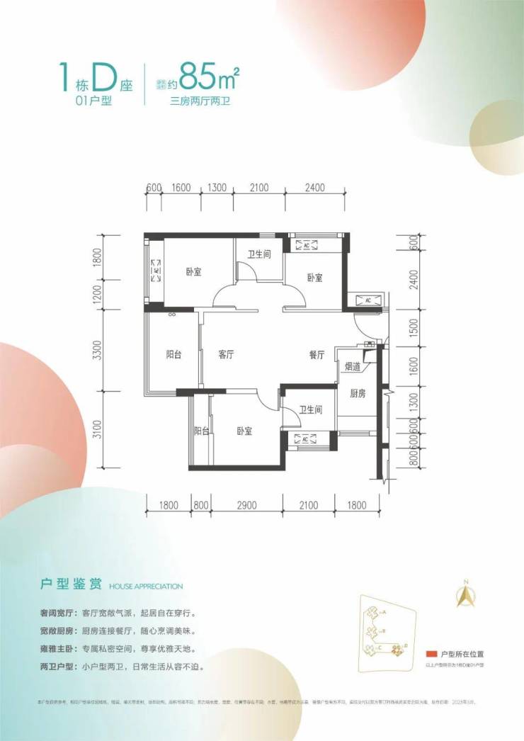85㎡的3房2厅2卫,1栋D座01户型,设计的是竖厅双龙抱珠格局,客厅3.3米开间,3个卧室分别做到了3.1米/3米/2.4米的宽度,客厅主卧双阳台设计,L型厨房,卫生间干湿分离,得房率:78.12%(不含赠送),阳台朝西南向,看楼岗大道。