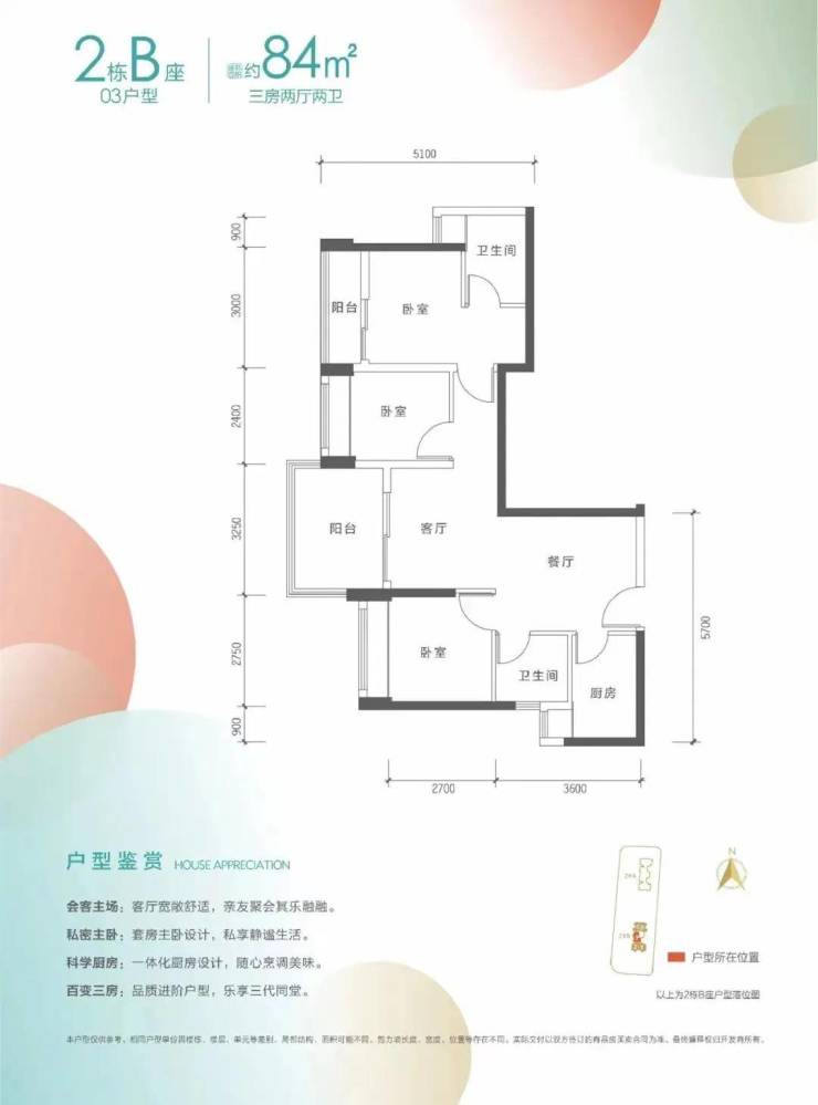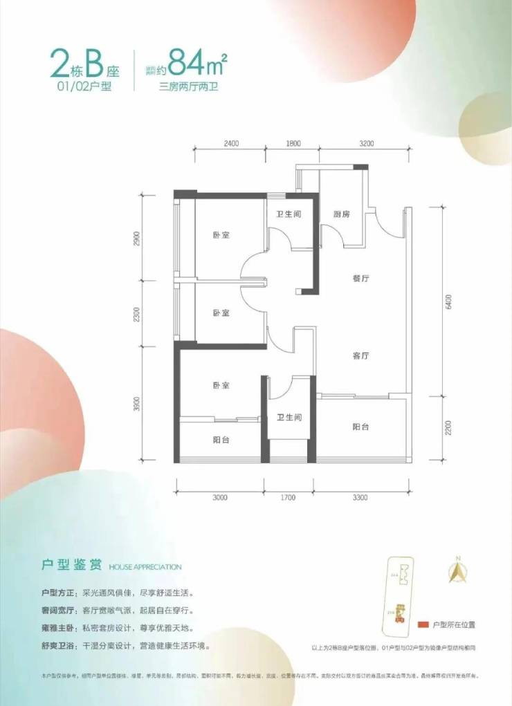 84㎡的3房2厅2卫,2栋B座01.02户型,设计的是竖厅格局,客厅3.3米开间,LDKB一体化,3个卧室分别做到了3米/2.9米/2.3米的宽度,客厅主卧双阳台设计,L型厨房,公卫三段式分离,得房率:76.04%(不含赠送),阳台朝南向,看楼岗大道。