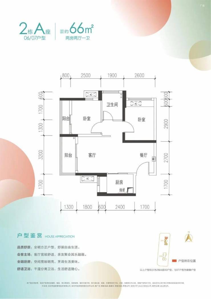 66㎡的2房2厅1卫,2栋A座06.07户型,设计的是竖厅格局,客厅3.2米开间,2个卧室分别做到了3米/2.6米的宽度,客厅主卧双阳台设计,U型厨房,卫生间干湿分离,得房率:74.05%(不含赠送),阳台朝西向看楼岗公园或东向看旁边的前进公社小区。