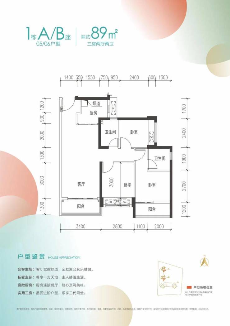 89㎡的3房2厅2卫,1栋A/B座05.06户型,设计的是竖厅双龙抱珠格局,客厅3.4米开间,3个卧室分别做到了3.1米/2.8米/2.4米的宽度,客厅主卧双阳台设计,U型厨房,卫生间干湿分离,得房率:78.12%(不含赠送),阳台朝东南向看楼岗公园或园景。