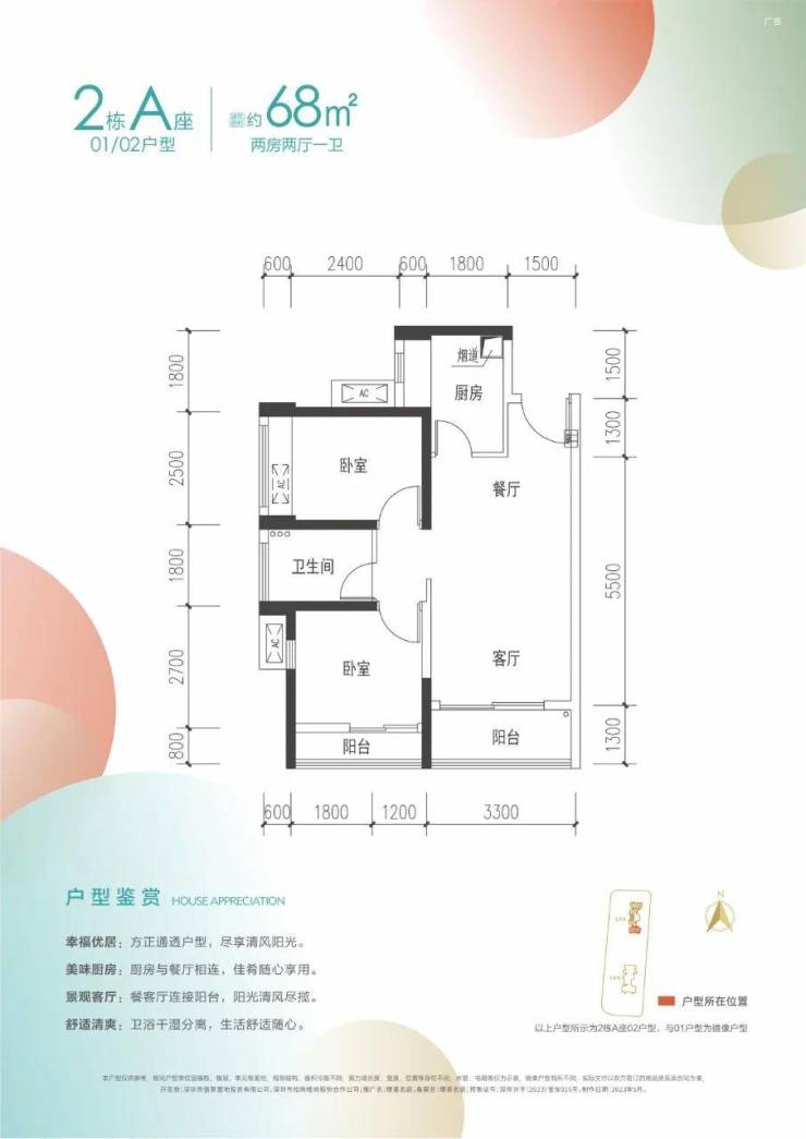 68㎡的2房2厅1卫,2栋A座01.02户型,设计的是竖厅格局,客厅3.3米开间,LDKB一体化,2个卧室分别做到了3米/2.5米的宽度,客厅主卧双阳台设计,U型厨房,卫生间干湿分离,得房率:74.05%(不含赠送),阳台朝正南向,看园林景观。