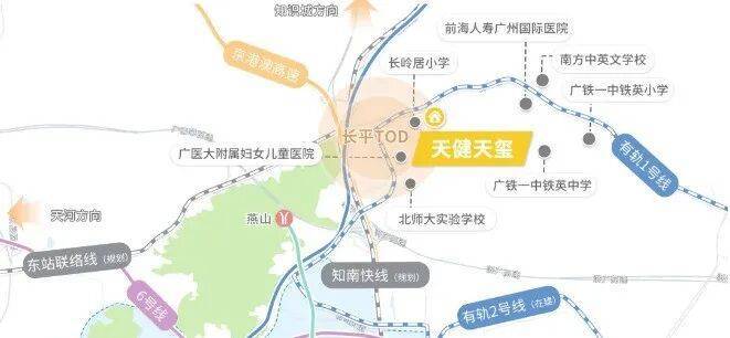项目直连黄埔区有轨电车1号线,2站接驳地铁21号线长平站,可一站换乘地铁6、7号线。未来两条高速地铁(知南快线、广从快线)也将交汇于此:可实现南沙12分钟到长平、广州东站9分钟到长平。