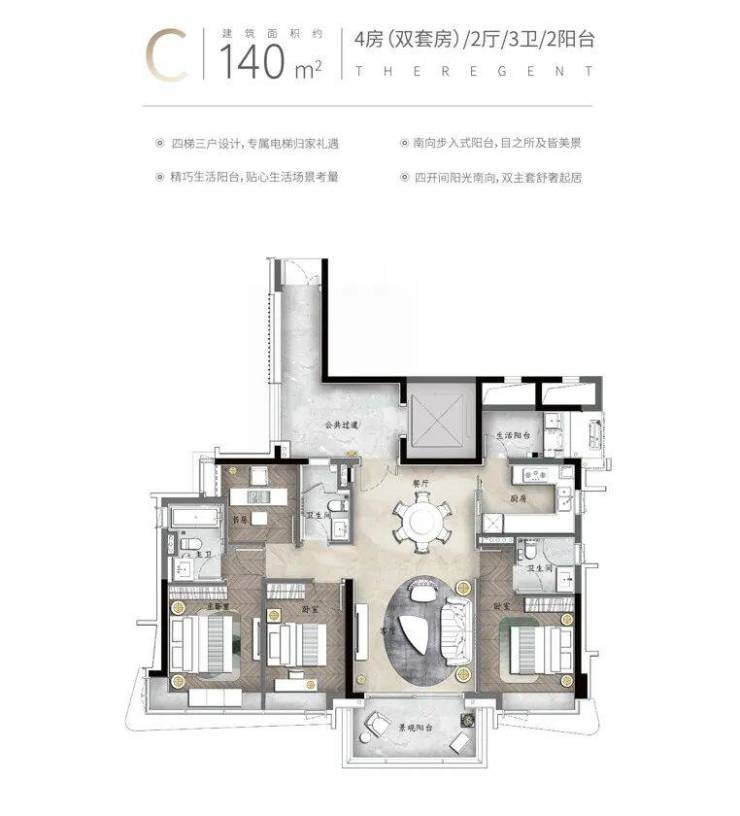 南天名苑的户型设计尽显奢华与匠心,满足不同客户对高品质生活的追求。『天启』组团推出约 140 - 250㎡环幕临江大平层,专梯专户四房双套房设计,坐拥江景第一排,500 米宽阔无遮挡江景视野尽收眼底。三大全球知名设计大师倾力打造,配备 12 大国际一线品牌交标,为世界灵感前沿作品。其中,约 250㎡一线环幕江景大宅,虽无板房实景图,但户型与 270㎡相近,尽显大气奢华;约 200㎡一线临江环幕大宅,空间布局合理,尽享江景之美;约 140㎡南向园景大宅,南向采光充足,园景相伴,惬意舒适。
