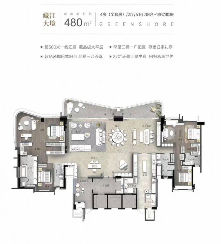 湾流 480㎡天幕揽江大平层,更是跨越时代的岛尖藏品。4 套房 2 厅 5 卫 + 1 多功能房设计,罕见三梯一户配置,尊崇归家礼序。超 500 米一线江景,超 16 米邮轮式阳台,270°环幕江景主套,世纪华人奢豪宅邸大师梁志天亲自参与室内设计,荟萃世界各地珍贵石材,顶奢级豪华家电卫浴品牌交标,全城仅 16 席,是恒世珍藏资产。