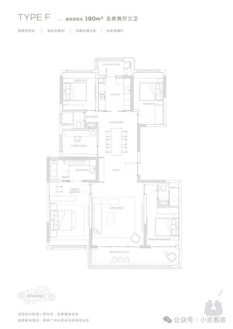 所有楼栋均为16-17层纯板式小高层设计,专梯专户,打造低密舒适人居奢宅。7.1米、270度零死角的超宽视野,打造广州之最,7.1米无界横厅,折叠IMAX影院级宽幕落地窗景 。打造广州首座全铝玻璃幕墙住宅作品——全铝玻璃幕墙仅被用于世界级豪宅