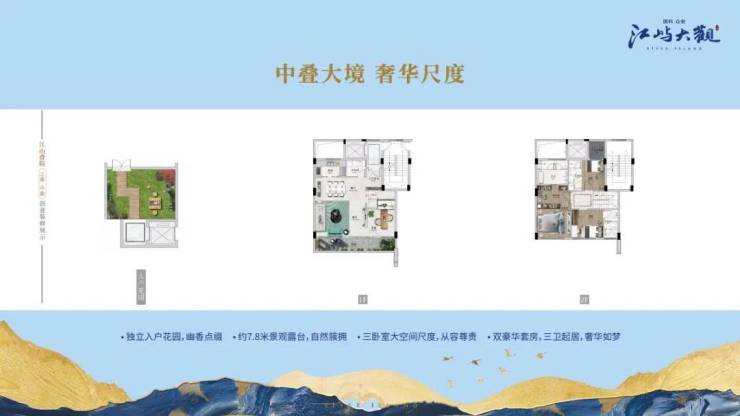 建筑面积约13万方江岸巨著,集商务、办公、居住于一体,主力产品为江山叠院、江景公馆,自规划美学园林、科创广场、文化中心、老年中心等奢级配套,属于城央之上的纯粹高端住区。