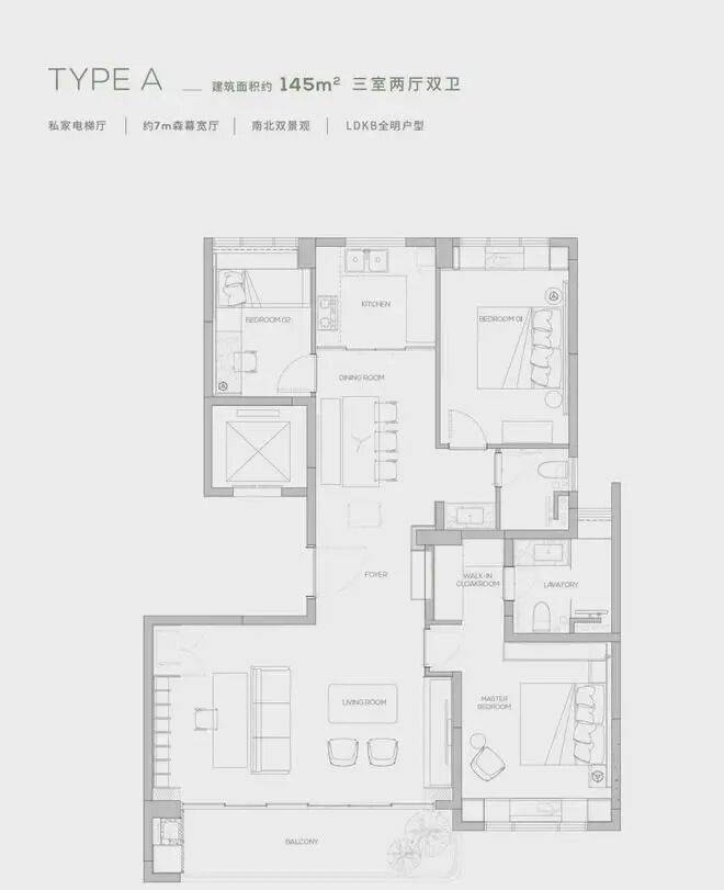 145产品为三房两厅两卫产品,餐厨一体化设计, 7米宽厅可切换各种生活场景,畅享宽幕般景观界面。