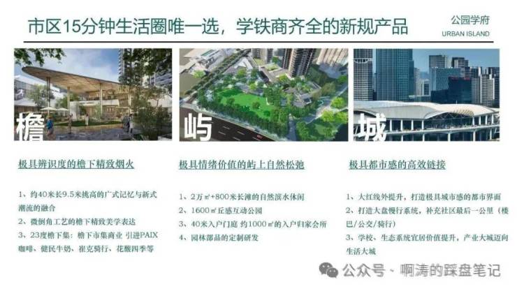 畅享艺文松弛场域:源自岛屿的立体森系景观布局,形成城市公园屿群、社区公园交互岛链、滨水度假后湾,三大主题组团,囊括全时社交需求。