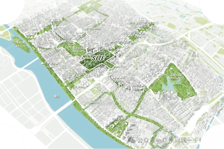 这片绿地将北接暨南大学,南达猎德净水厂、临江带状公园,西连珠江公园,东至天河公园。通过绿廊和慢行连接,打开城市界面,形成连续的生态网络,优化区域空间结构,提升城市生态品质。同时,也与环五山高校园区延伸下来的百年学府文脉相承接,通过大面积绿地,无缝衔接建筑与公园,提升公众获得感。