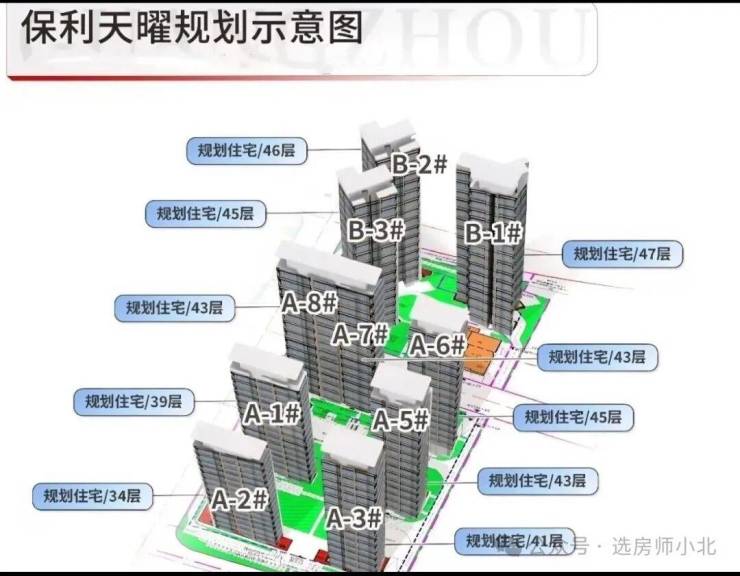 保利天曜共分由两个地块组成,分别为南北两个地块,北地块规划了3栋住宅,2梯3户和2梯4户,北地块3栋塔楼,B1栋47层、B2栋46层、B3栋45层;南地块由7栋板楼组成。