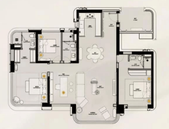 建面约140㎡的四房两厅三卫,独立电梯间,双主卧套房。