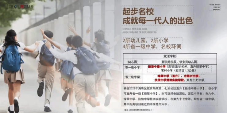 根据 2022 年海珠区教育局政策,附近部分社区可直升新港中路小学,该小学直升绿翠中学,也可选择电脑派位,派位中学均为省一级学校,其中距离项目最近的中学是市六中。