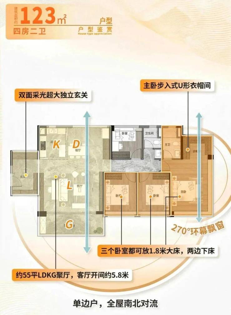 123㎡四房两卫,独立入户花园,南北对流,动静分区,厨房带岛台设计,客厅开间约5.8米连通大景观阳台,南向卧室空间都很大,主卧带衣帽间+270°大飘窗。