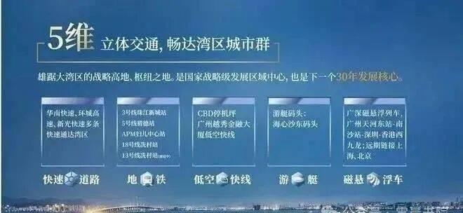 低空快线:CBD停机坪(广州越秀金融大厦低空快线)轨道交通:3号线、5号线、APM线、18号线、13号线(建设中)广深磁悬浮(规划中)快速路:华南快速、环城高速、新光快速多条快速通达湾区游艇码头:海心沙东码头(可停靠游艇半小时)