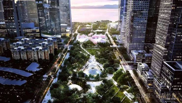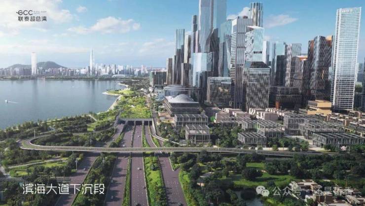 深超总拥有海、湖、湿地、公园、高尔夫五重稀缺生态资源,通过中央绿轴打造"超级校园"生态模式。滨海大道下沉,将释放约10万平方米地面空间,无缝连接深圳湾公园,形成连续的滨海公共空间。中央绿轴地下空间面积约30万平方米,投资95亿元,将建成连接地下枢纽与地面生态的超级系统。这种设计使深超总成为高密度城市环境下生态融合的典范,实现"在城市中漫步自然,在自然中享受城市"。