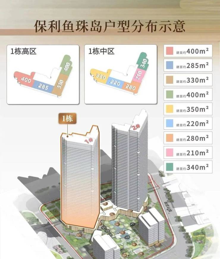 首推1栋大平层,户型为200-400㎡ 在规划上,保利鱼珠岛一共4栋建筑,1栋和2栋为大平层,大约是400多户。 首推的是1栋大平层,高50层,建筑面积大概分为200-300-400平。