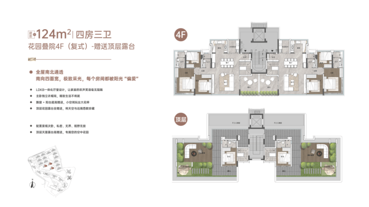 ·超⾼赠送空间:⼀层享环绕式私家花园,⼆⾄四层分别配置专属露台 / 天⾯空间,拓展⽣活场景(如茶室、阳光房、空中花园);