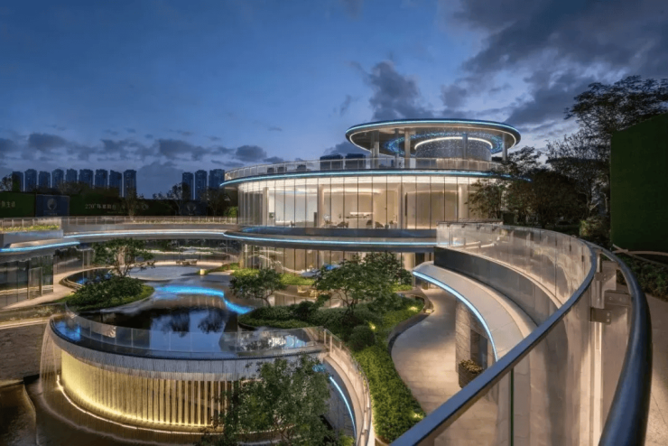 在立体下沉式叠瀑庭院中央,设计团队构筑了约3000m²的星环会所,精巧融合活流静水、珠江银河、日光星辰的概念。