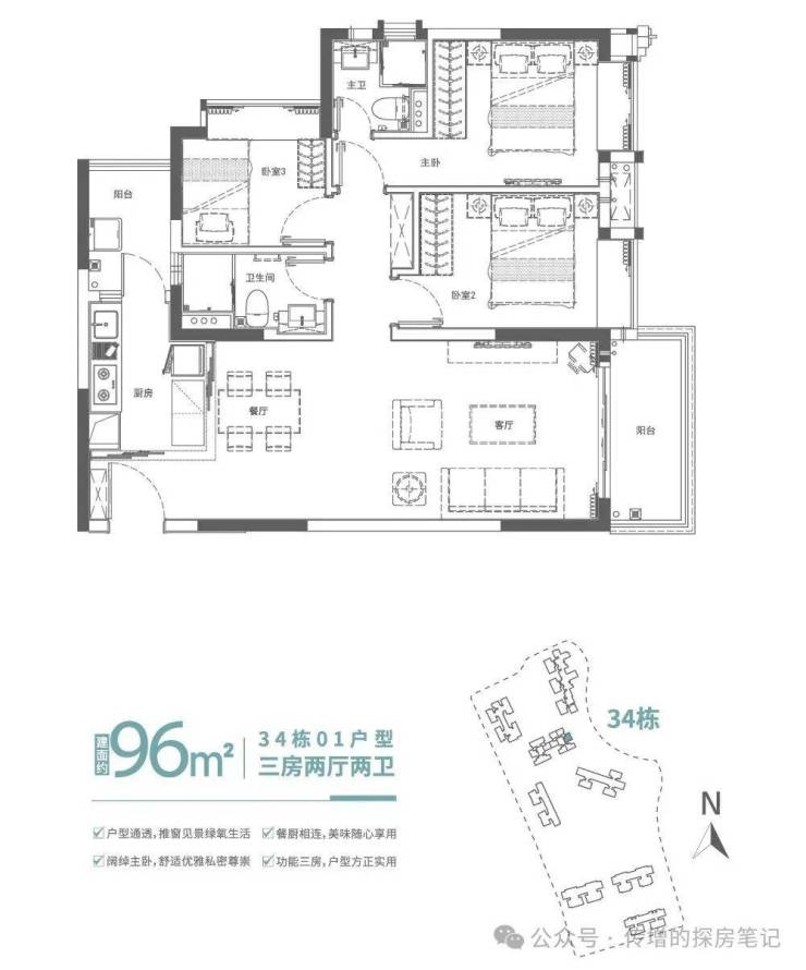 建面约96㎡滨水舒适三房,餐客厅一体化,连通观景阳台,臻藏生活美景,客厅与休息区以科学合理的布局分隔,动静皆从容,卧室均规划大面宽飘窗,放大房间尺度感,营造舒适生活体验。