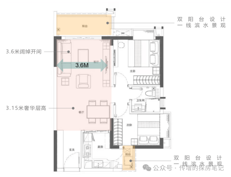 双阳台设计,同时厅出阳台约3.6米,望珠江千米滨水长廊,匹配都市精英生活格调,打造精致轻奢质感。